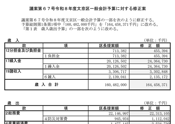 「令和8年度文京区一般会計予算に対する修正案」